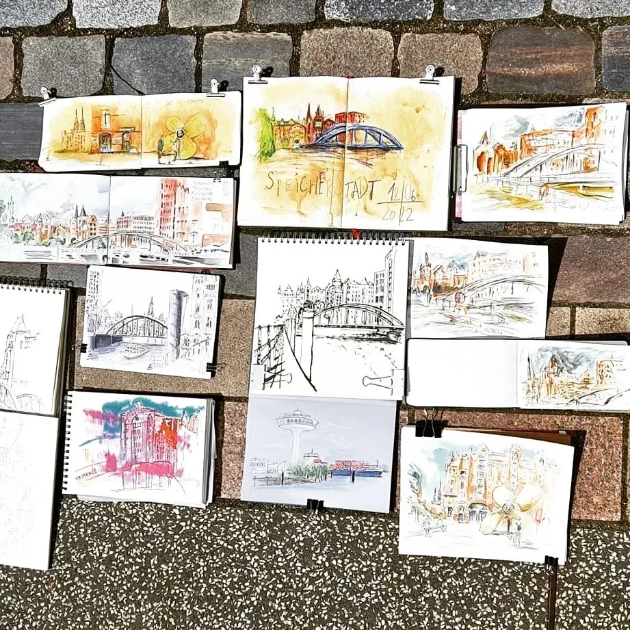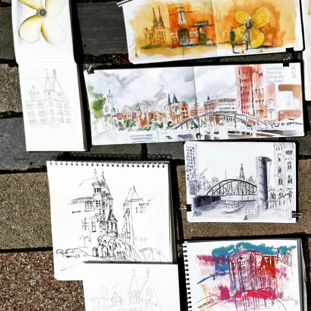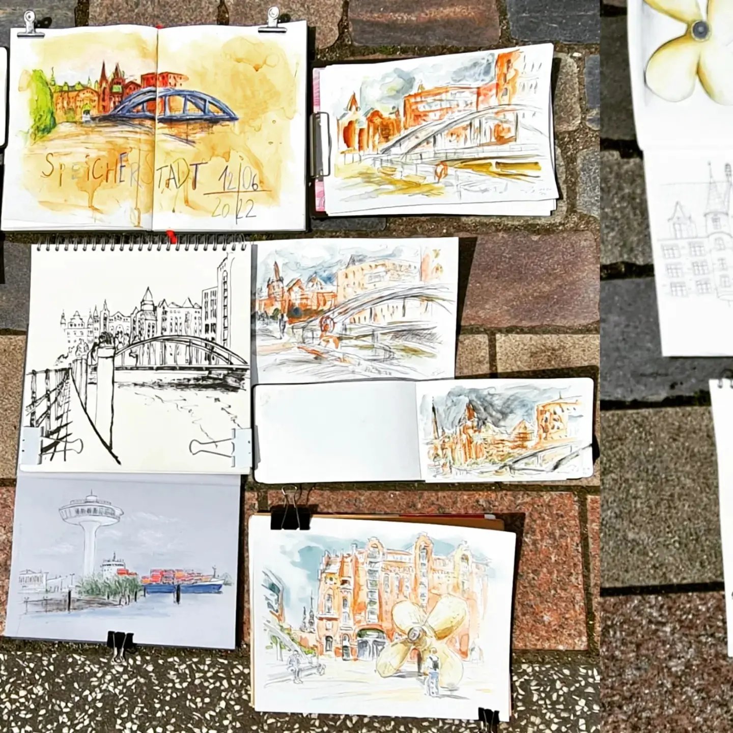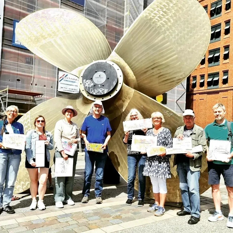 Sketchertreffen in der #Speicherstadt / #Elbtorquartier. Foto an der 6×6 m großen #Schiffsschraube vor dem Maritimen Museum. Sie wurde als Ersatz für den Tanker Maaskerk gefertigt. Schönes Treffen war’s! #urbansketchershamburg #Skizze #sketching #uskhamburg
