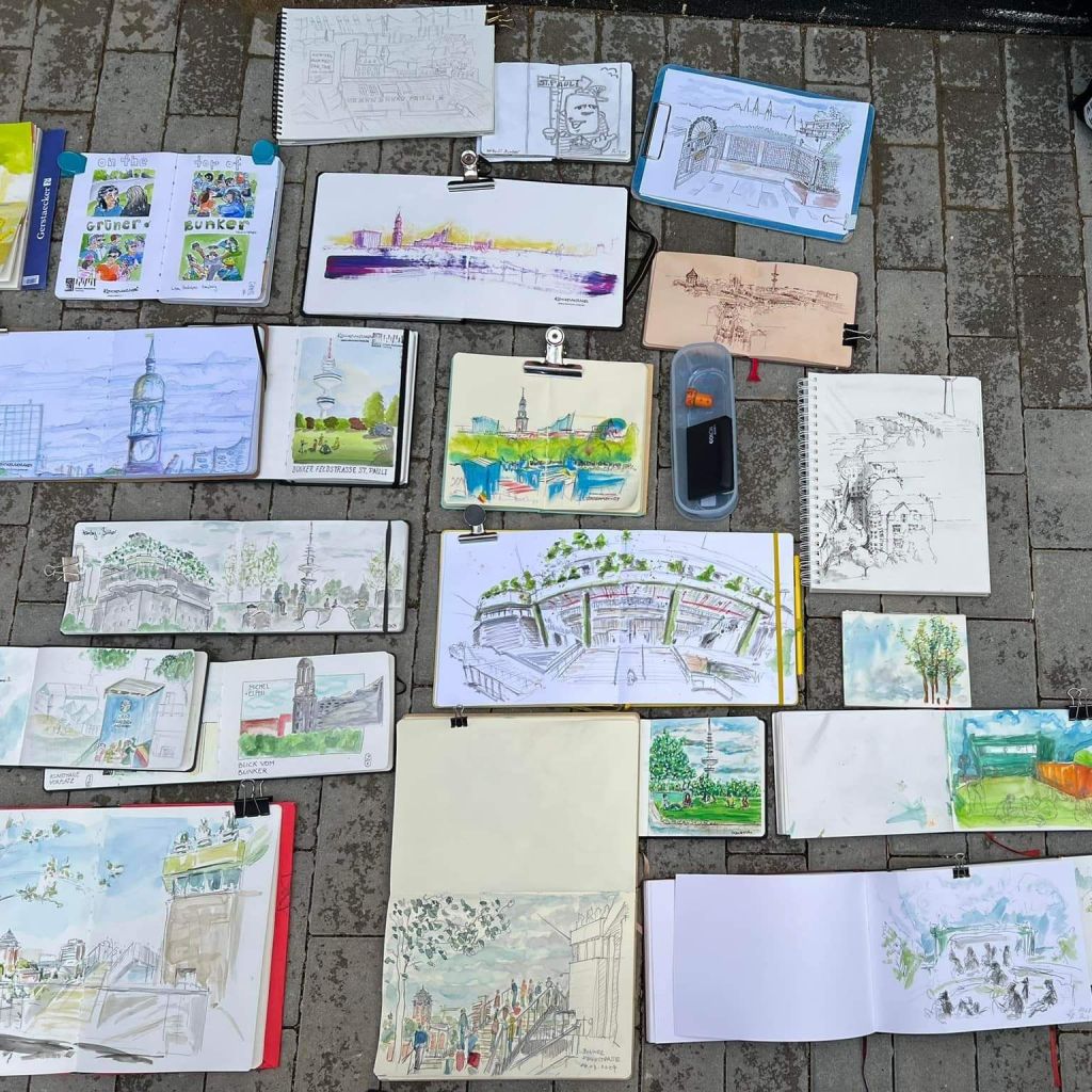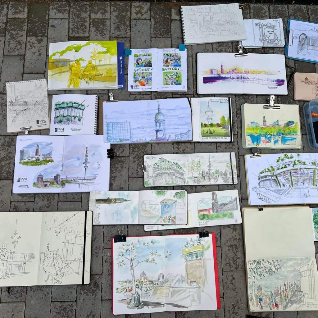 35 Urban Sketchers am Sonntag auf dem Bunker St. Pauli. Ein Park wurde auf dem Bunker errichtet und für die Öffentlichkeit geöffnet. Der 40m hohe Kriegsbunker ist heute Veranstaltungs-, Kultur- und Sportzentrum und Park. #urbansketchershamburg #BunkerStPauli #ukhamburg #sketching #Skizze #grünaufgrau #ufeldstraße