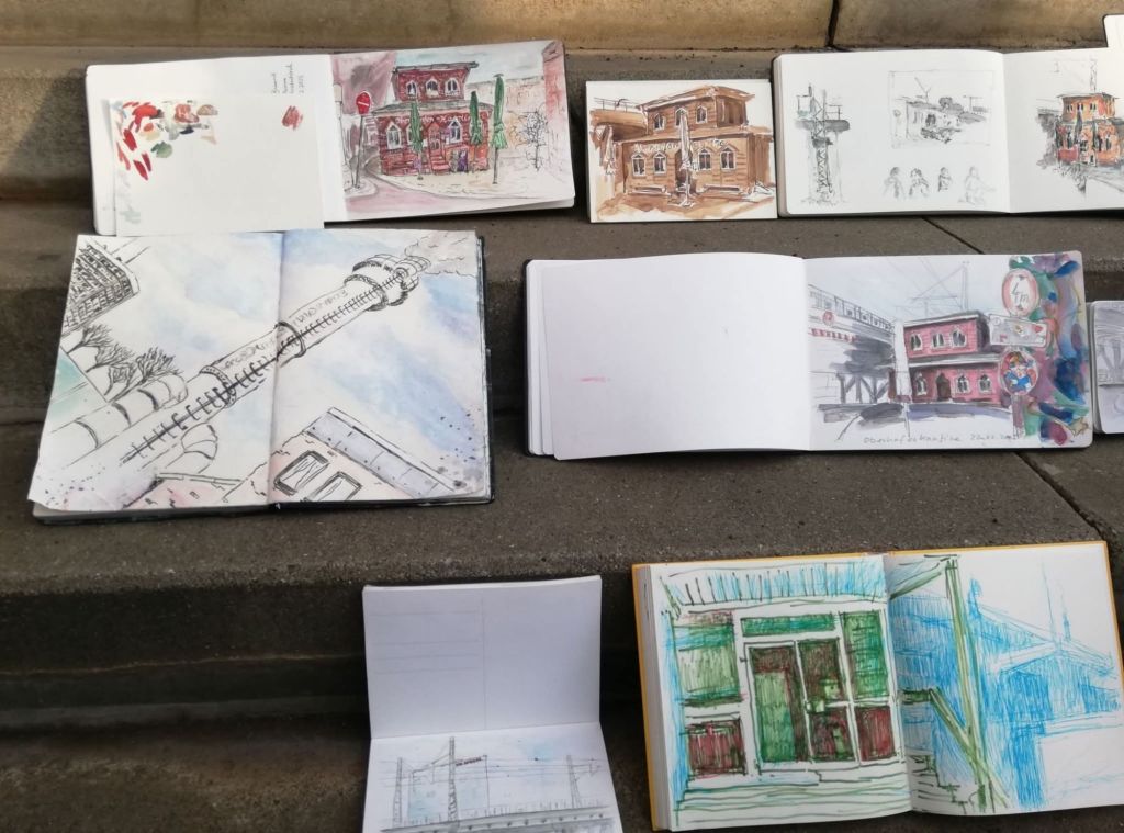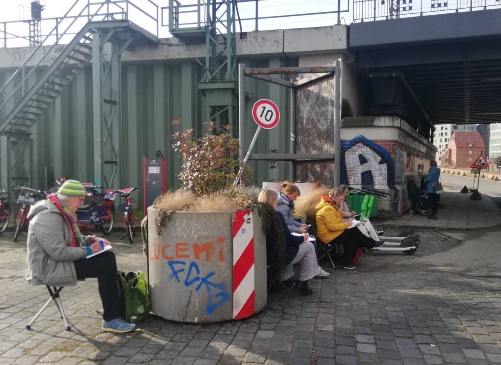 Etwa 15 Sketcherinnen und Sketcher waren heute im Oberhafen dabei. Neue und alte Gesichter. Schön – das hat Spaß gemacht und schön, dass so viele spontan Zeit und Lust hatten!